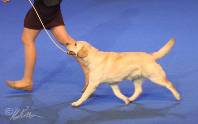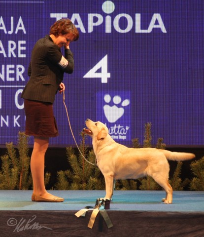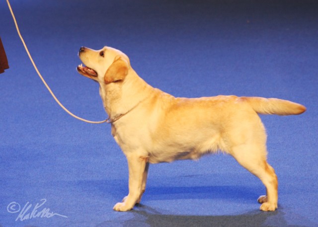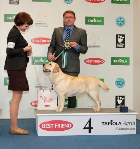 “Beautiful yellow bitch with lovely temperament, good head, alert expression with kind eye, good reach of neck, good topline, in good coat and condition, excellent mover and beautifully presented.” Finnish Labrador Specialty 4.2.2012, 4th in Open Class.