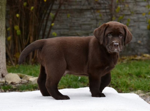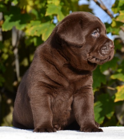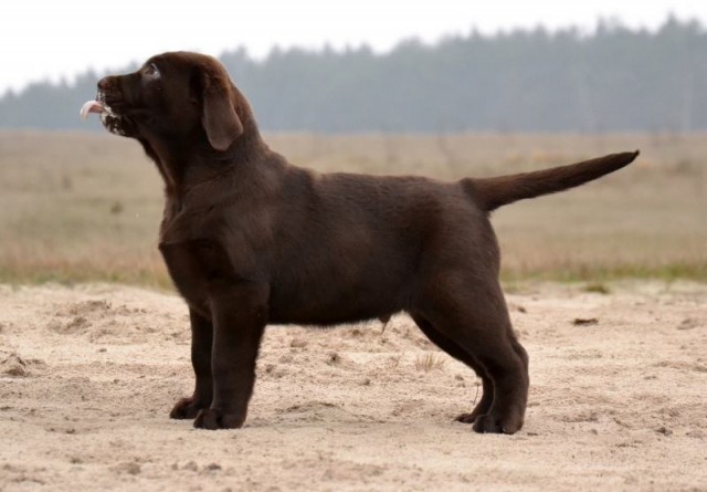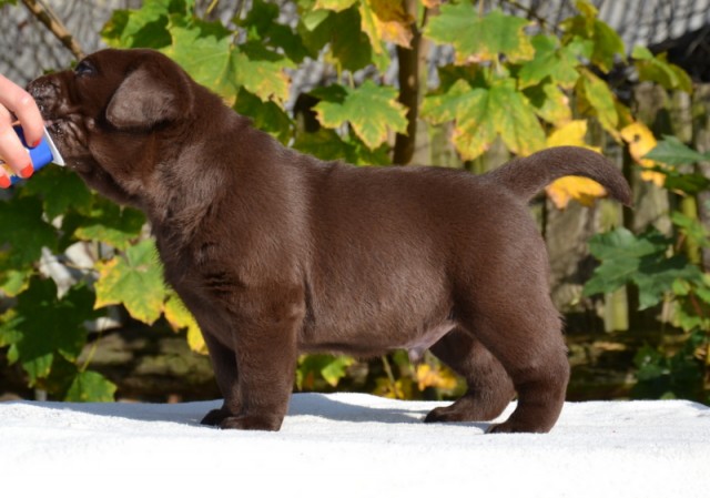 “Very attractive well built chocolate dog, little light in eye color, good clean neck, excellent shoulders, good depth of chest, well boned legs, nice stiffle, overall very attractive, very matured for his age.”